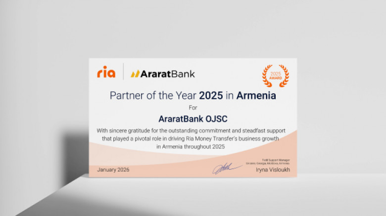 ԱրարատԲանկը 2025 թվականի արդյունքներով արժանացել է RIA Money Transfer համակարգի  Հայաստանում «Տարվա գործընկեր» մրցանակին։ Բանկն այս մրցանակին արժանանում է արդեն յոթերորդ տարին անընդմեջ, ինչը վկայում է կողմերի միջև ձևավորված երկարամյա արդյունավետ համագործակցության, ինչպես նաև ոլորտում ԱրարատԲանկի կայուն և առաջատար դիրքերի մասին։