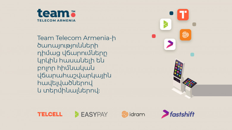 ՀասարակությունTeam Telecom Armenia-ն («Տելեկոմ Արմենիա» ԲԲԸ) տեղեկացնում է, որ վերսկսել է համագործակցությունը Telcell, EasyPay, Idram և Fast Shift ընկերությունների հետ: