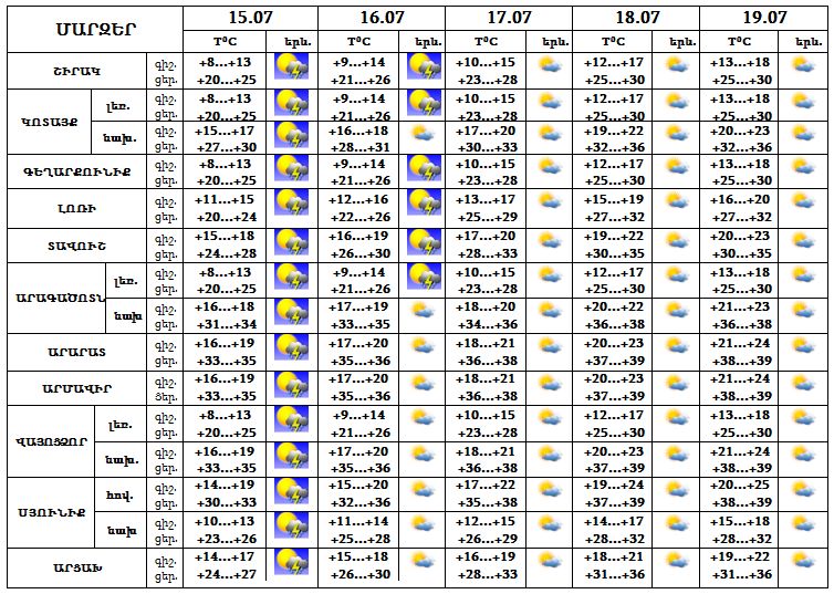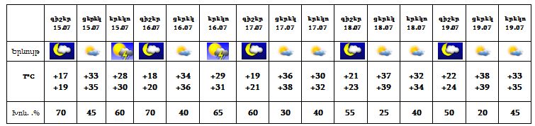 Հուլիսի 15-ի երեկոյան ժամերին շրջանների զգալի մասում, 16-ին հյուսիսային շրջաններում սպասվում է կարճատև անձրև և ամպրոպ, ամպրոպի ժամանակ սպասվում է քամու ուժգնացում` 15-20 մ/վ, առանձին հատվածներում հնարավոր է կարկուտ։ 17-19-ը սպասվում է առանց տեղումների եղանակ: