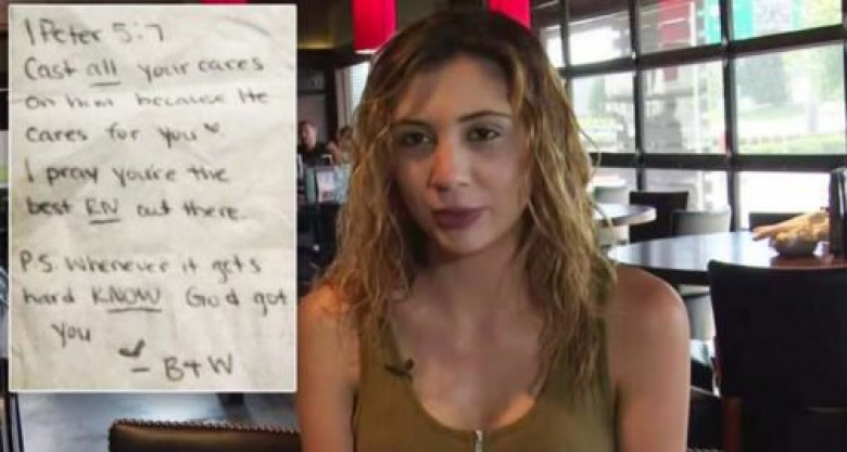 Երբ մատուցողուհին զույգի հաշիվը տարավ՝ 20 դոլար, նկատեց որ նրանք գրությամբ ծրար էին թողել, որտեղ ասվում էր այն չբացել մինչև աշխատանքը չավարտեր և չհեռանար բարից: