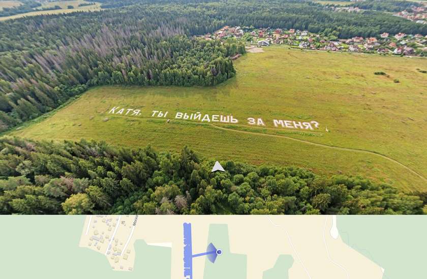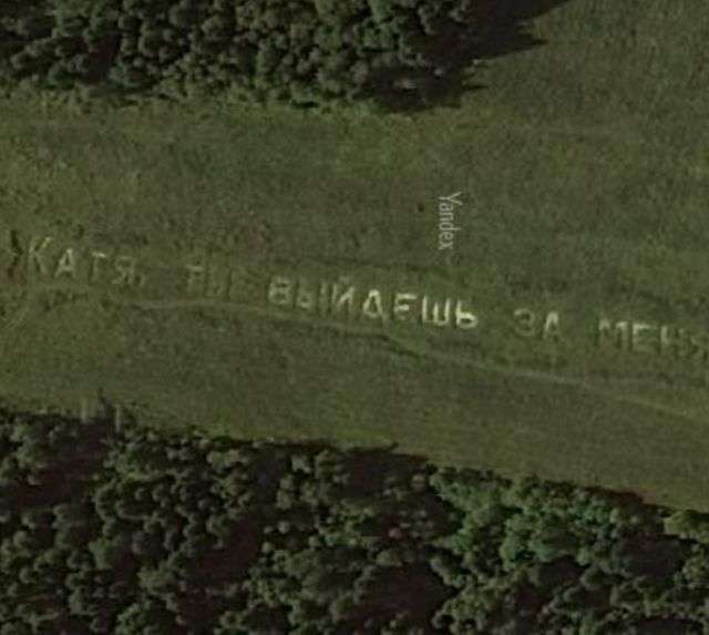 LifeՕդապարիկով թռչելիս տղան 250 մետրանոց տարօրինակ գրություն նկատեց դաշտում։ Արդեն տանը, քարտեզով նայելիս պարզ դարձավ, որ դա ամուսնության առաջարկություն է և ռուսերեն գրված էր «Катя, ты выйдешь за меня?»։ Ինչպես հետո պարզվեց՝ սիրահարի ջանքերն ու 5 օր տևած քրտնաջան աշխատանքն իզուր է եղել, քանի որ Կատյան մերժել էր նրան։ Չնայած տխուր ավարտին՝ այնուամենայնիվ գրությունը դեռ պահպանվում է առցանց քարտեզների վրա։