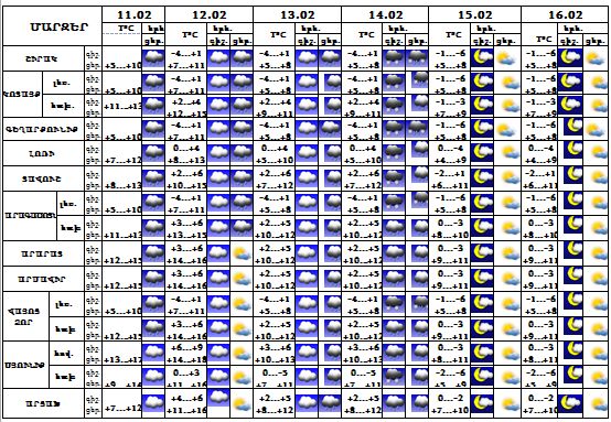 Քամին՝ հարավ-արևմտյան՝ 3-8 մ/վ արագությամբ: Օդի ջերմաստիճանը 12-ին կբարձրանա 4-6 աստիճանով: