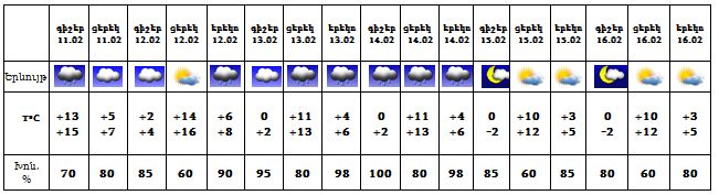 Երևան քաղաքում փետրվարի 11-ի ցերեկը, 12-ին քաղաքի առանձին հատվածներում սպասվում է թույլ և կարճատև անձրև, 13-ին՝ օրվա երկրորդ կեսին, 14-ին ժամանակ առ ժամանակ սպասվում է անձրև: 15-16-ը սպասվում է առանց տեղումների եղանակ: