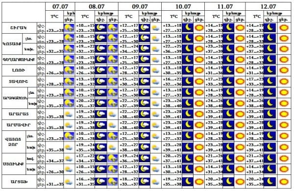 Հուլիսի 7-8-ին կեսօրից հետո առանձին շրջաններում սպասվում է կարճատև անձրև և ամպրոպ, 9-12-ին սպասվում է առանց տեղումների եղանակ: Քամին՝ հարավ-արևմտյան՝ 3-8մ/վ, 7-8-ին երեկոյան ժամերին՝ քամու ուժգնացում մինչև 15-20 մ/վրկ: Օդի ջերմաստիճանը 7-ին կնվազի 2-3 աստիճանով, 9-10-ին կբարձրանա 3-4 աստիճանով: