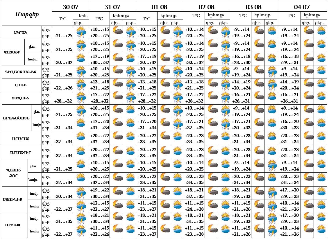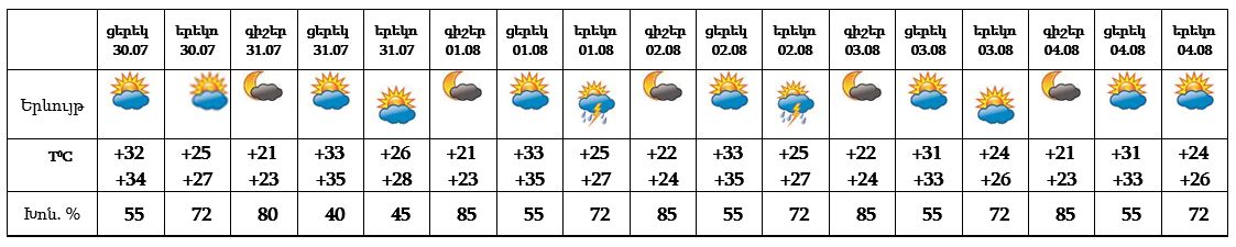 Հուլիսի 31-ին, օգոստոսի 3-4-ը սպասվում է առանց տեղումների եղանակ: Օգոստոսի 1-2-ը՝ գիշերը և երեկոյան, քաղաքի առանձին հատվածներում սպասվում է կարճատև անձրև և ամպրոպ, ամպրոպի ժամանակ` քամու ուժգնացում՝ 20-22 մ/վ: