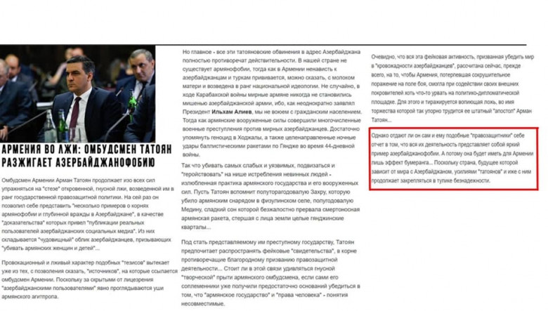 Ադրբեջանական լրատվամիջոցներից մեկը հրապարակել է հերթական նյութը ՀՀ մարդու իրավունքների պաշտպանի մասին՝ ատելություն հրահրելու հաշվին անելով քաղաքական եզրահանգումներ, օրինակ` «Քանի որ երկիրը, որի ապագան կախված է Ադրբեջանի հետ խաղաղություն հաստատելուց, «Թաթոյանների» ու նրա համակիրների ջանքերով շարունակում է ամրապնդվել հուսահատության փակուղում»։