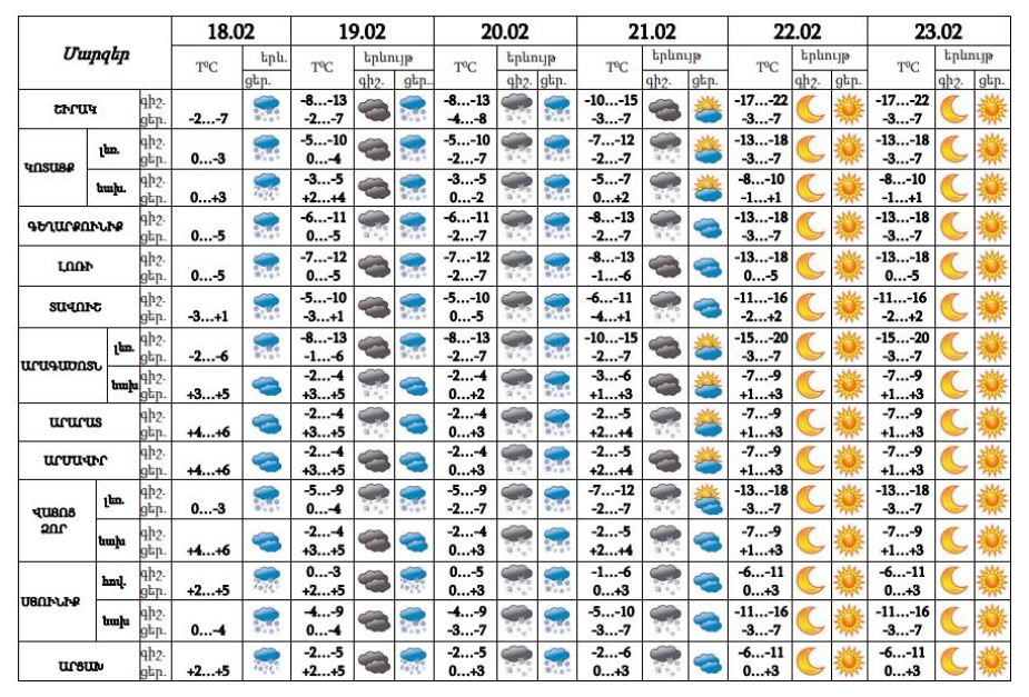 ՀասարակությունՀանրապետության տարածքում՝ Փետրվարի 19-ին, 21-ի գիշերը առանձին շրջաններում, 20-ին շրջանների զգալի մասում ժամանակ առ ժամանակ սպասվում է ձյուն: Փետրվարի 21-ի ցերեկը, 22-23-ը սպասվում է առանց տեղումների եղանակ: Քամին՝ հարավ-արևմտյան՝ 5-10 մ/վ Օդի ջերմաստիճանը փետրվարի 18-ի ցերեկը, 21-22-ն աստիճանաբար կնվազի 7-10 աստիճանով։