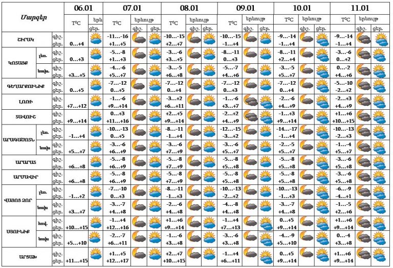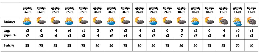 Երևան քաղաքում հունվարի 6-ի ցերեկը, 7-11-ը սպասվում է առանց տեղումների եղանակ: