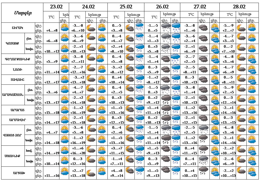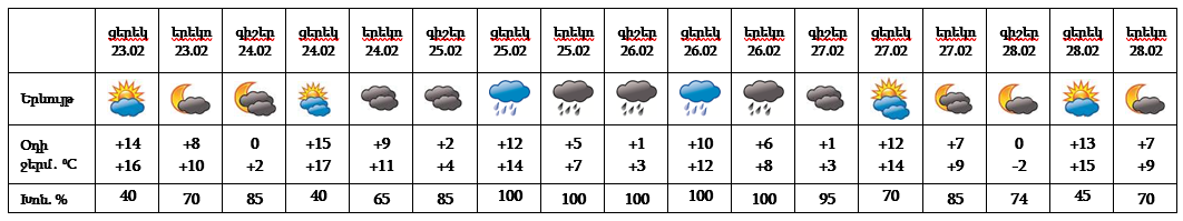 Հանրապետության տարածքում` փետրվարի 23-ի ցերեկը, 24-ին, 25-ի գիշերը, 27-ի ցերեկը, 28-ին սպասվում է առանց տեղումների եղանակ:
