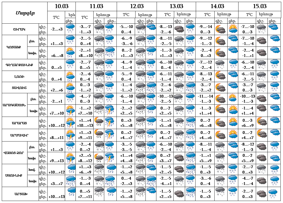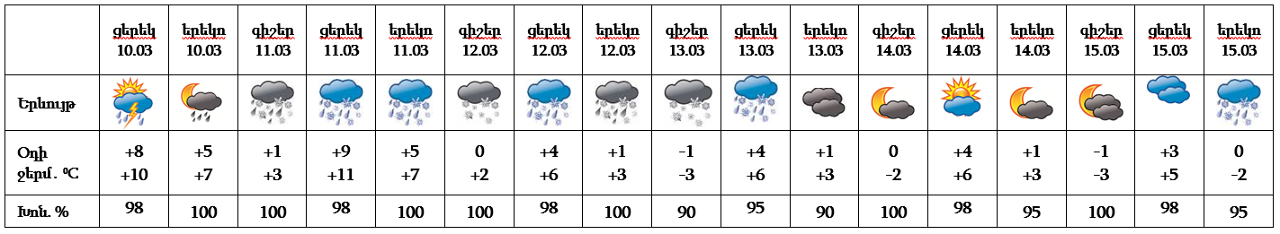 Հանրապետության տարածքում` մարտի 10-ի ցերեկը, 11-13-ին, ժամանակ առ ժամանակ շրջանների զգալի մասում, 14-15-ին առանձին շրջաններում սպասվում են տեղումներ, առանձին հատվածներում ինտենսիվ։