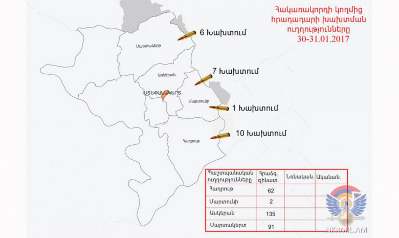ՀասարակությունՀունվարի 30-ին և լույս 31-ի գիշերը ղարաբաղա-ադրբեջանական հակամարտ զորքերի շփման գծում հակառակորդը տարբեր տրամաչափի հրաձգային զինատեսակներից, այդ թվում՝ դիպուկահար հրացաններից, հրադադարի պահպանման ռեժիմը խախտել է շուրջ 25 անգամ՝ հայ դիրքապահների ուղղությամբ արձակելով ավելի քան 290 կրակոց: Ադրբեջանական զինուժը դիպուկահար հրացաններից առավել ինտենսիվ կրակ է վարել հարավային և արևելյան ուղղություններով՝ ընդհանուր առմամբ արձակելով 56 կրակոց: