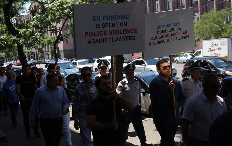 Օրերս տեղի ունեցավ ՀՀ-ում գործունեություն ծավալող մի քանի տասնյակ փաստաբանների բողոքի երթը, որը կապված էր փաստաբանների նկատմամբ արդեն որերորդ անգամ կիրառվող բռնությունների, ի մասնավորի՝ ոստիկանության բաժնում հունիսի 7-ին փաստաբան Կարեն Ալավերդյանին ոստիկանության մի խումբ ծառայողների կողմից ծեծի ենթարկելու, նրա նկատմամբ ձեռնաշղթաներ ու արցունքաբեր գազ կիրառելու հանգամանքով (ի դեպ, այս ամենից հետո Ալավերդյանը ձերբակալվել է և խուզարկության ենթարկվել)։ Փաստաբանները պալատի վարչական շենքից շարժվել և իրենց բողոքի ձայնն են բարձրացրել Հայաստանում ԵՄ պատվիրակության գրասենյակի դիմաց: