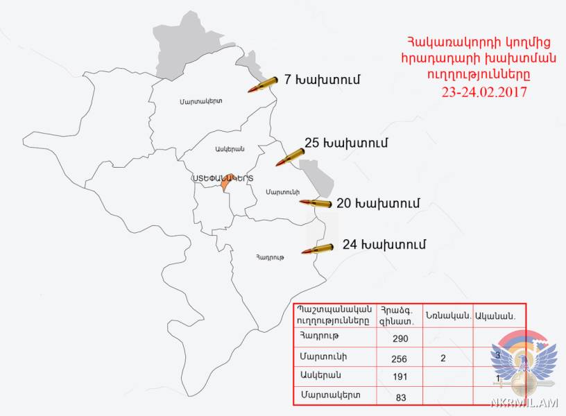 Ինչպես տեղեկացնում է ԱՀ ՊՆ մամուլի ծառայությունը, շփման գծի արևելյան ուղղությամբ ադրբեջանական զինուժը կիրառել է 60 և 82 միլիմետրանոց ականանետեր (4 արկ) և ՁՀՆ-7 տիպի նռնականետ (2 արկ):
