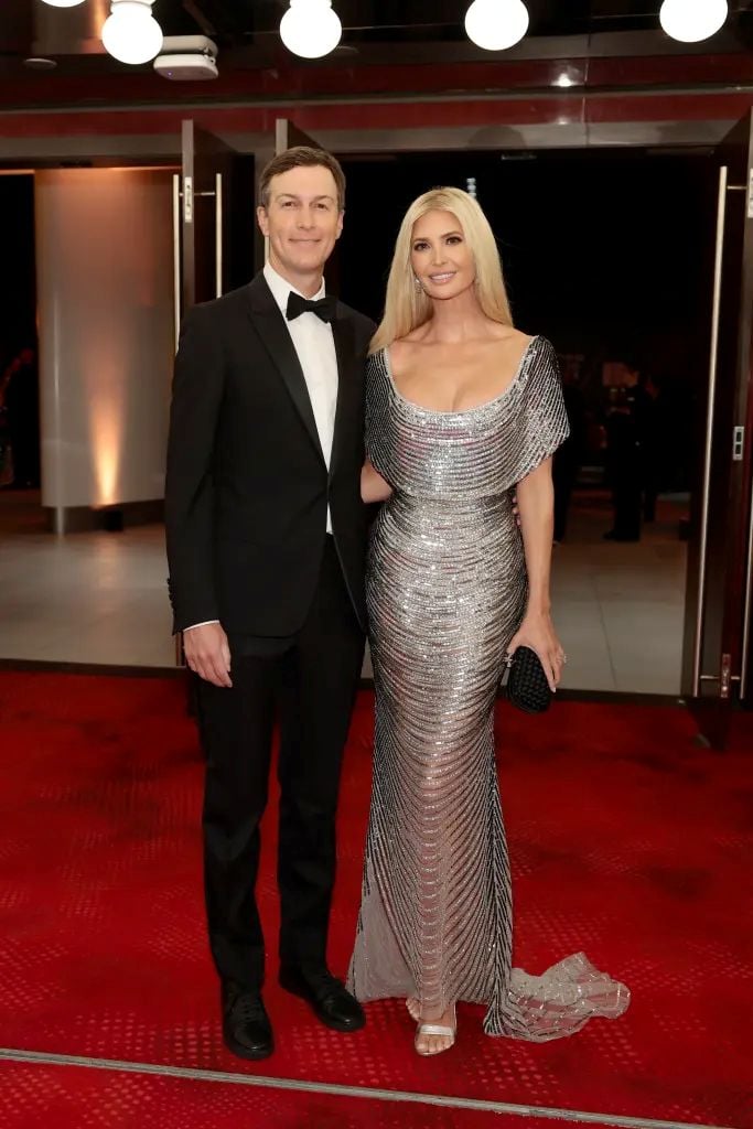 Иванка дополнила образ серебристыми туфлями и чёрным плетёным клатчем Bottega Veneta, а волосы уложила идеально прямыми. Джаред Кушнер, её супруг, вышел в классическом чёрном костюме с бабочкой.
