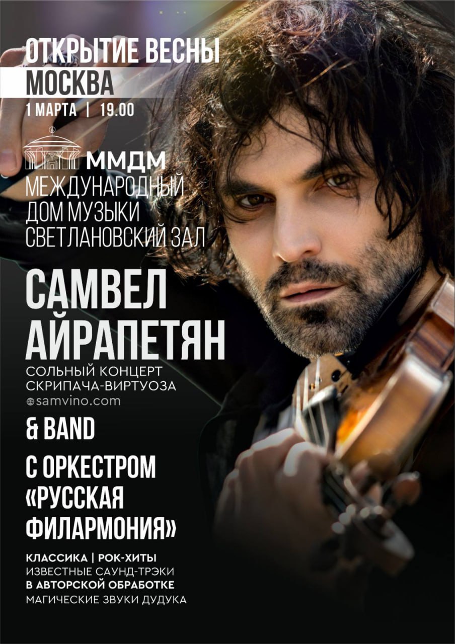 Не пропустите1 марта в 19:00 в Московском международном Доме музыки пройдет концерт скрипача-виртуоза Самвела Айрапетяна и его бэнда при участии оркестра «Русская филармония». Гостей ждет экспрессивное шоу, объединяющее классику и современное звучание.