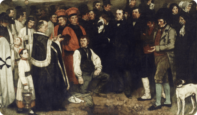 Կուրբեի 315 x 668 սմ չափերով աշխատանքն իսկական հեղափոխություն էր իր ժամանակի համար. գյուղական բնակիչներին պատկերելով բնական չափերով և ծայրահեղ ռեալիզմով (մինչև մաշկի և հագուստի երանգները) նա սովորական գյուղական թաղման տեսարանը վերածեց լայնածավալ կտավի: Մինչդեռ այն ժամանակ դա խախտում էր ժանրային հիերարխիայի սահմանները. սովորաբար նման չափերը վերապահված էին աստվածաշնչյան և դիցաբանական թեմաներին: