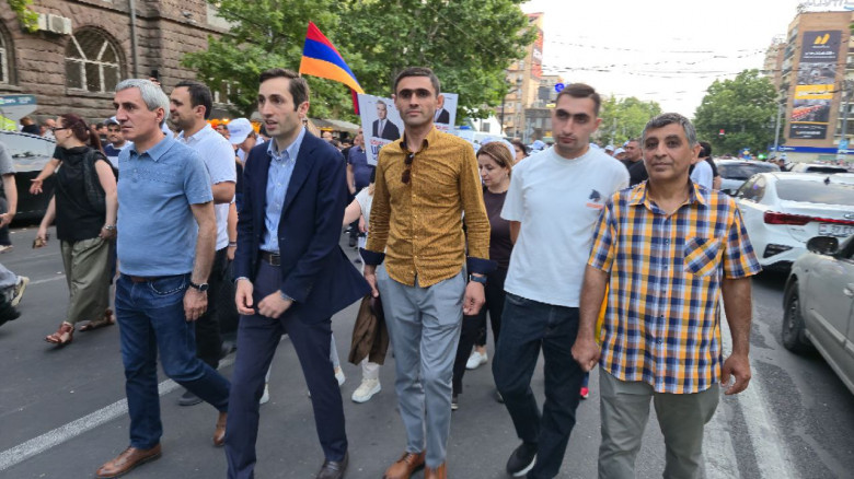 Լուսավոր Հայաստան կուսակցության փոխնախագահ Դավիթ Խաժակյանը թիմակիցների հետ մասնակցում է Սամվել Կարապետյանի պաշտպանության երթին