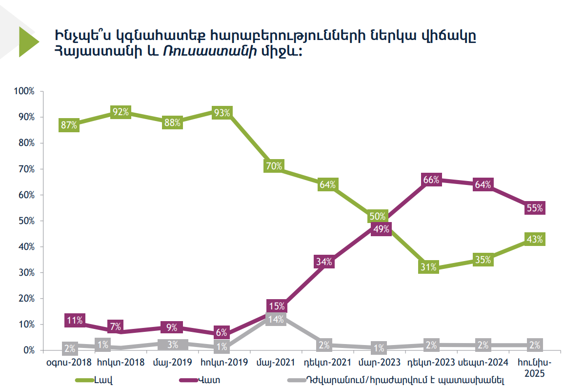 ՔաղաքականությունԱմերիկյան միջազգային հանրապետական ինստիտուտի վերջին հարցումները չափազանց ուշագրավ մի տենդենց են արձանագրում։ Մասնավորապես, հարցերից մեկը վերաբերում էր Հայաստանի և Ռուսաստանի միջև հարաբերությունների ներկայիս վիճակին։ 2025 թվականի հունիսին հարցվածների 55 տոկոսը վատ է գնահատել հարաբերությունների ներկայիս վիճակը, դրական՝ միայն 43 տոկոսը։ Առաջին հայացքից այս զարգացումը կարող է տարօրինակ թվալ, բայց հաշվի առնելով նախորդ հարցումների հետ, չէ՛, բավականին ուշագրավ պատկեր ենք ստանում։