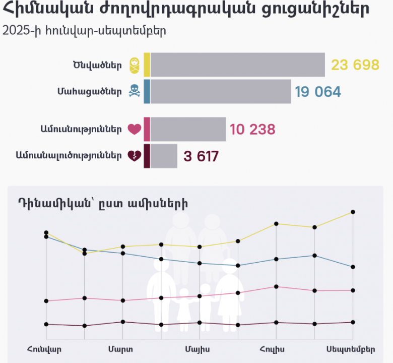 Կոմիտեի տվյալներով՝ հունվար-սեպտեմբերին Հայաստանում ծնվել է 23 698 մարդ՝ 1244-ով պակաս 2024 թվականի նույն ժամանակահատվածի ցուցանիշից (24 942)։ Դիտարկվող ժամանակահատվածում ՀՀ-ում մահացել է 19 064 մարդ։ Մահացության դեպքերը 2024 թվականի համեմատ այս տարի ավելացել են (2024 թ. մահացել է 18 959 մարդ)։ Ըստ վիճակագրական կոմիտեի՝ 2025 թ. 9 ամսում ՀՀ-ում ամուսնացել է 10 238 մարդ, մինչդեռ 2024 թ. նույն ժամանակահատվածում ամուսնացել է 11 696 մարդ։ Այս տարի մի փոքր ավելացել է ամուսնալուծությունների թիվը՝ 3 617 (2024 թվականին ամուսնալուծվել է 3 422 մարդ)։