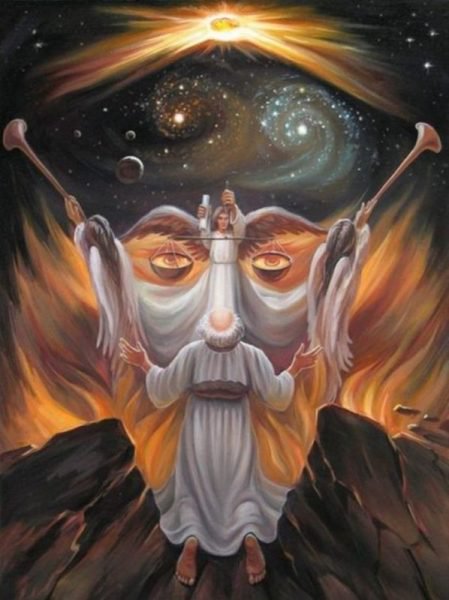 Հրեշտակ։ Մարդիկ, ովքեր առաջին հերթին նկատում են կենտրոնում երևացող հրեշտակին, անհատականություն են։ Ուշադիր են շրջապատի նկատմամբ, հստակորեն զգում են խոսակցի տրամադրության անկումները, հեշտությամբ գուշակում բառերը, որոնց կարիքը նա ունի։ Բնավորության առանձնահատկության հետևանքով մշտապես ապրումների մեջ են։ Նրանց հետաքրքրում է բացառապես ամեն բան, ինչ կապված է մտերիմների ու հարազատների հետ։ Անհրաժեշտ է հասկանալ, որ կան երևույթներ, որոնք ձեր իշխանության ներքո չեն։ Սովորեք տագնապներով չապրել։ Աջակցություն ցուցաբերեք, եղեք սիրելիների կողքին, բայց մի ապրեք մշտական մտածմունքներով։