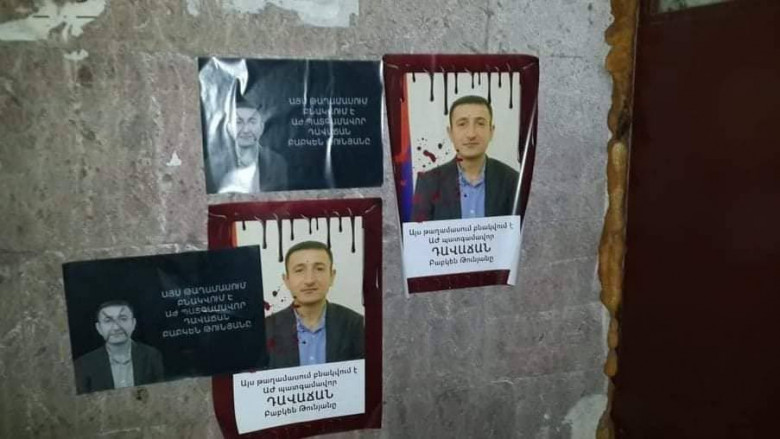Փակցված պաստառների վրա գրված են՝ «Այս թաղամասում բնակվում է դավաճան Բաբկեն Թունյանը»։