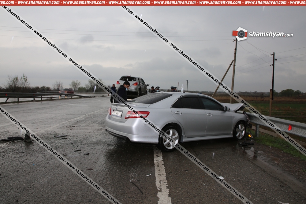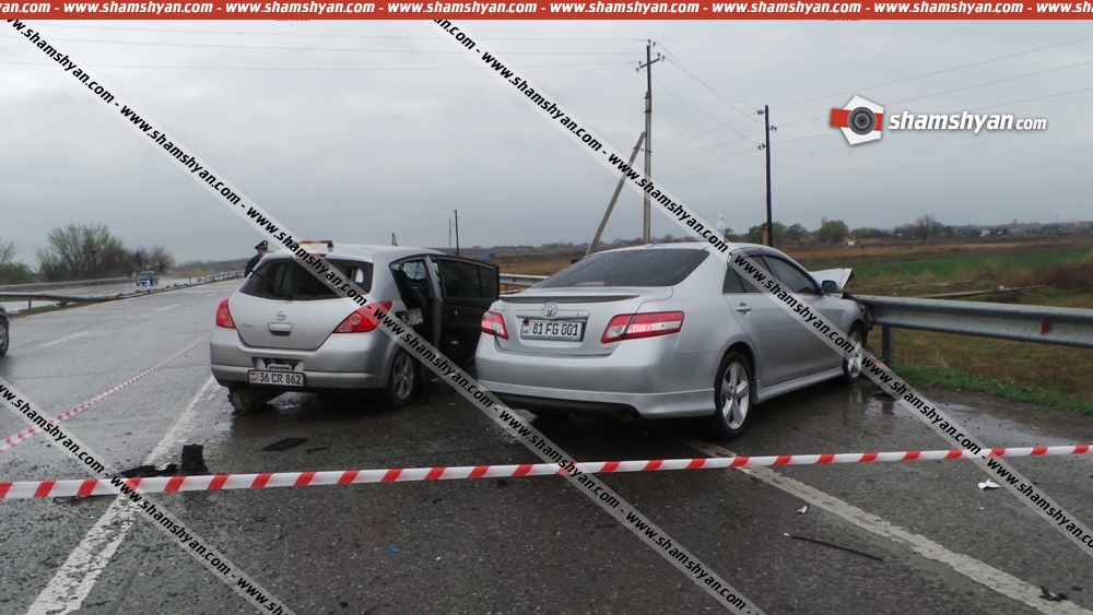 ՀասարակությունԱյսօր՝ ապրիլի 11-ին, խոշոր ավտովթար է տեղի ունեցել Արարատի մարզում: Ժամը 08:50-ի սահմաններում Երևան-Երասխ ավտոճանապարհի 25-րդ կմ հատվածում Nissan Tiida մակնիշի ավտոմեքենան դեպի Երասխ ընթանալիս, դեռևս անհայտ հանգամանքներում, դուրս է եկել ճանապարհի երթևեկելի գոտուց, բախվել բաժանարար գոտու երկաթե արգելապատնեշներին, կոտրել դրանք, դուրս եկել հանդիպակաց երթևեկելի գոտի և ճակատ-ճակատի բախվել դեպի Երևան ընթացող Toyota Camry մակնիշի ավտոմեքենային:
