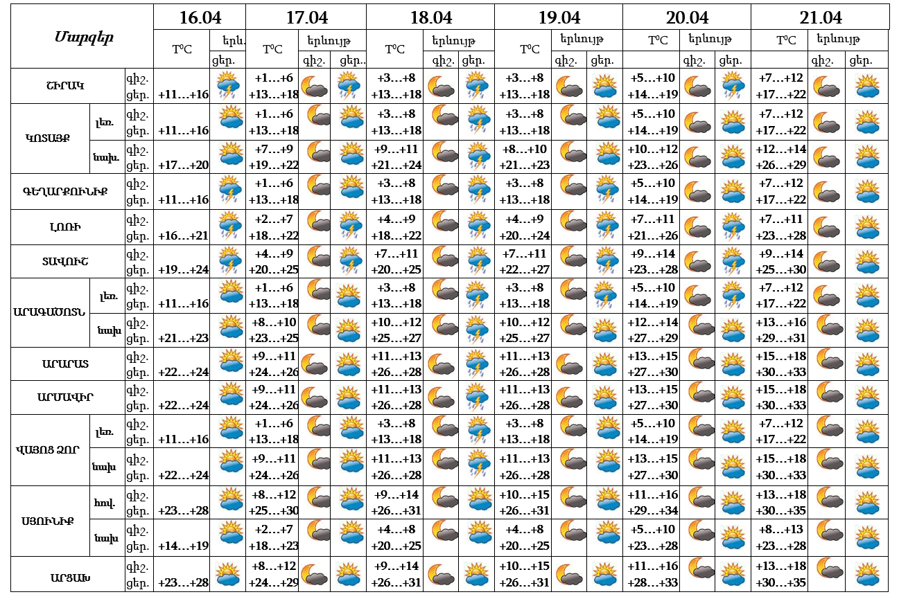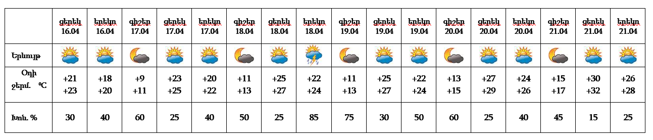 Հանրապետության տարածքում՝ ապրիլի 16-ի ցերեկը, 17-ին, 19-20-ին՝ հիմնականում կեսօրից հետո առանձին շրջաններում, 18-ի ցերեկը շրջանների զգալի մասում սպասվում է կարճատև անձրև և ամպրոպ։ Ապրիլի 21-ին սպասվում է առանց տեղումների եղանակ։