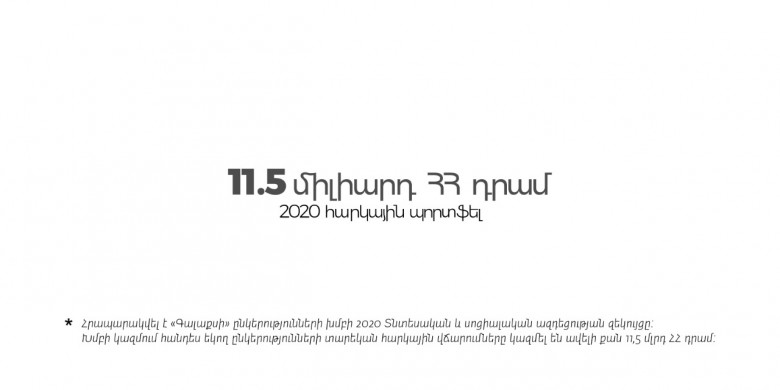 «Գալաքսի» ընկերությունների խմբում 2020թ.-ին միջին ամսական աշխատավարձը եղել է 364,716 ՀՀ դրամ, և պետական բյուջե է փոխանցվել ավելի քան 2 մլրդ ՀՀ դրամ եկամտային հարկ։ Ընկերությունների խմբի վարկային պորտֆելը 2020թ. տվյալներով կազմել է մոտ 60 միլիարդ ՀՀ դրամ (մոտ 115 միլիոն դոլար)։ Տեղական շուկայից գնումները կազմել են մոտ 36 մլն ԱՄՆ դոլար: