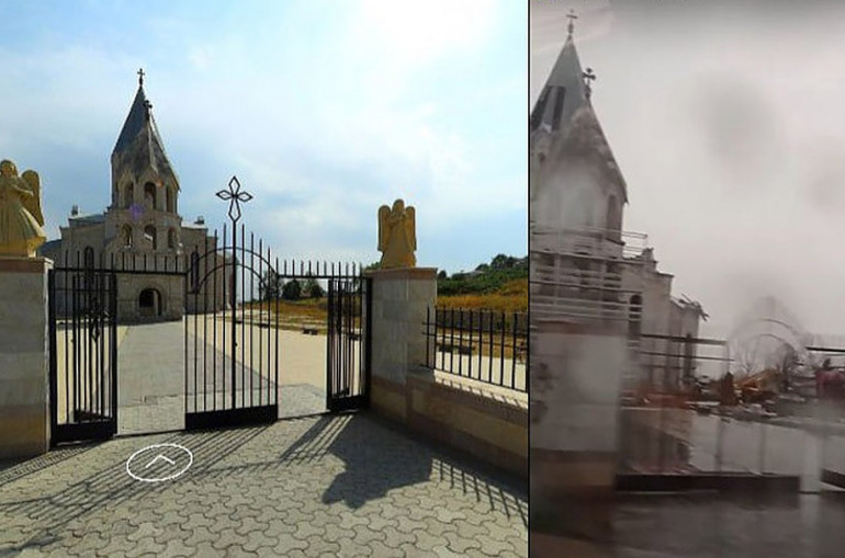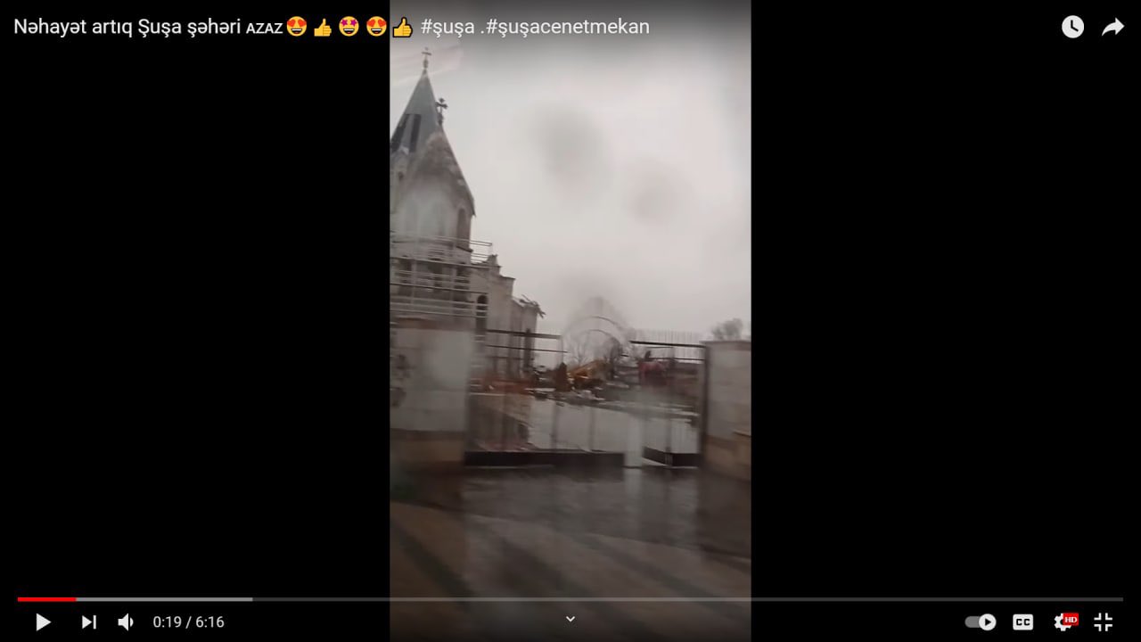 Տարածված տեսանյութում երևում է՝ ինչպես են ադրբեջանցիները քանդել ոչ միայն իրենց վերահսկողության տակ անցած հայկական Շուշի քաղաքի Սուրբ Ամենափրկիչ Ղազանչեցոց եկեղեցու դարպասների դիմաց գտնվող հրեշտակների քանդակները, այլև տաճարի շուրջ գտնվող պարիսպները։