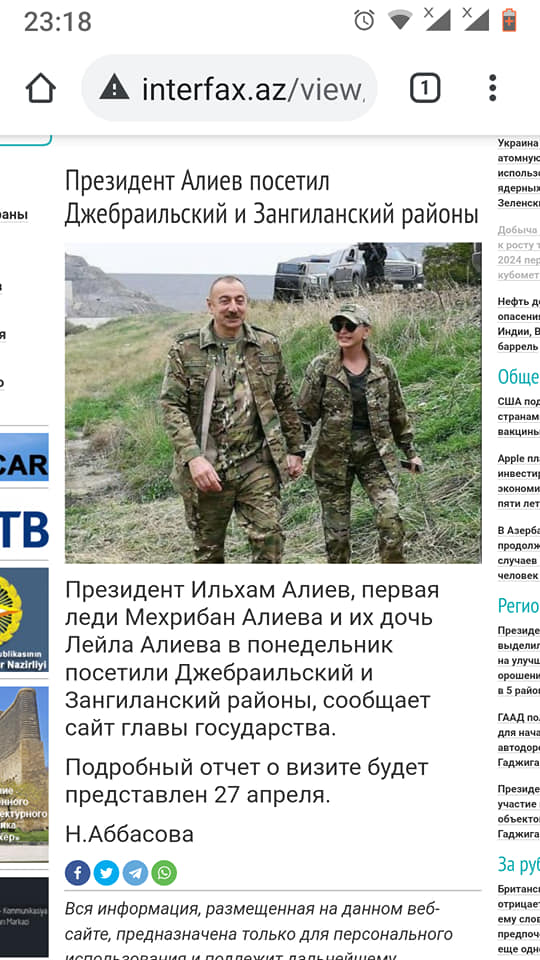 Շրջակա միջավայրի փոխնախարար Աննա Մազմանյանը, ում էջին այս անգրագետ տեքստն է և նկարները 21-24 ին ըստ իր իսկ տեղեկության եղել է Կապանում։ Իսկ այս օրը Ալիևները իրենց ընտանիքով, ըստ Մեհրիբան Ալիևայի ինստագրամի եղել են Ջաբրաիլի և Զանգելանի (իրենց անվան տարբերակներն եմ օգտագործում) տեղամասում։ Աննա Մազմանյանը տեղադրել է Զանգեզուր կենսոլորտային համալիրի մեջ ընգրկված "Սոսիների պուրակ" արգելավայրը։ Այդ բացառիկ բնության սոսիների շարքի շարունակությունը հենց Ալիևների նշված վայրն է։