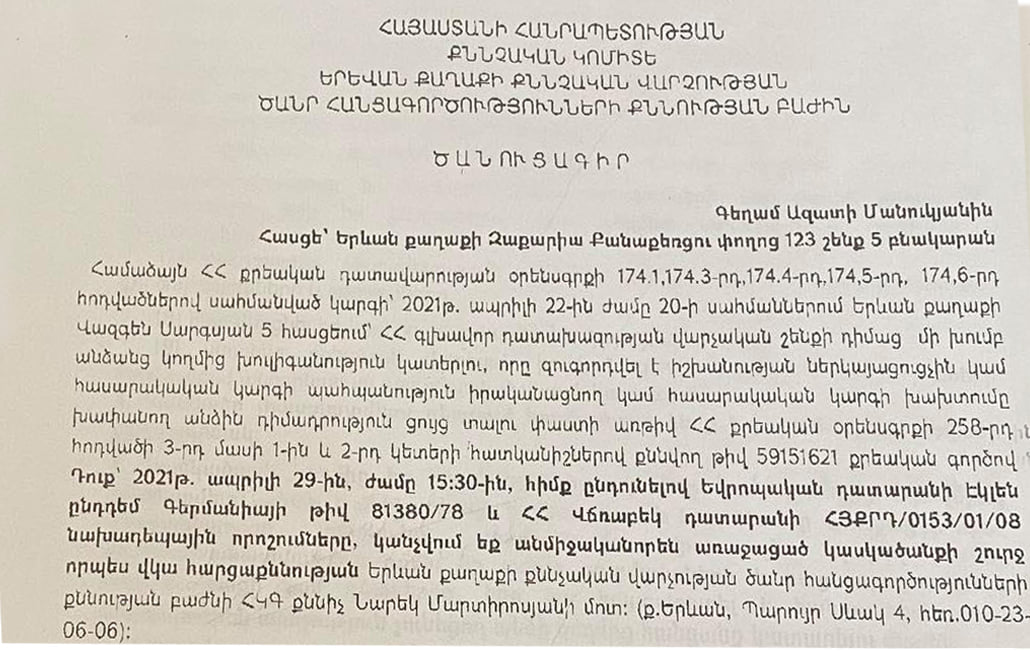Արծվիկ Մինասյանից, Գերասիմ Վարդանյանից հետո այսօր առավոտյան ոստիկանները մեր դուռն էլ թակեցին հարցաքննության ներկայանալու ծանուցագրով։ Իշխանությունն ու նիկոլը կատաղել են, չեն հանգստանում։ Նրանք սկսել են խոսել միայն քրեական գործերի լեզվով։ ՊԱՏՐԱՍՏ ենք։ Վարժ ենք։ Ուղղակի քննիչներն են մեղք մեր ձեռքը։ Այսօր 15։30, բոլորիս (կարծում եմ դեռ ցանկը մեծանալու է) կանչել են Երեւանի քաղաքի քննչական վարչություն։ Լավ չհասկացա՝ կասկածյալի կամ վկայի կարգավիճակով։ Ենթադրում եմ, որ տեղում արդեն մեղադրանք կառաջադրեն։ Բայց այդ շենք ուրիշ ապրումներով եմ մտնելու։