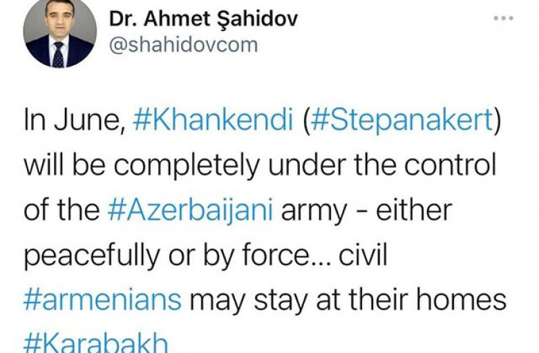 ՀասարակությունԱդրբեջանի դեմոկրատիայի և մարդու իրավունքների ինստիտուտի ղեկավար Ահմեդ Սահիդովն իր թվիթերյան էջում գրառումների շարք է սկսել, համաձայն որոնց՝ հունիս ամսին Ստեփանակերտն ամբողջությամբ անցնելու է Ադրբեջանի ԶՈւ հսկողության տակ։