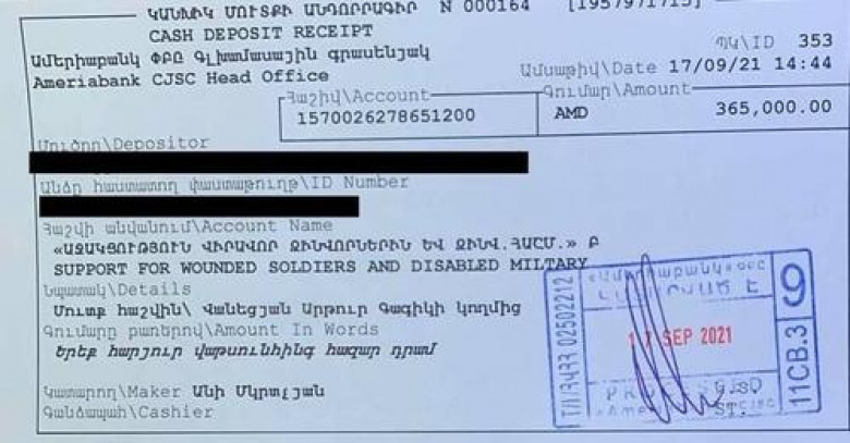 «Ի կատարումն «Պատիվ ունեմ» խմբակցության որոշման Արթուր Վանեցյանը այսօր ստացած պարգևավճարը փոխանցել է Զինվորի տուն վերականգնողական կենտրոնին»,- հայտարարել է «Հայրենիք» կուսակցության մամուլի քարտուղար Սոս Հակոբյանը։