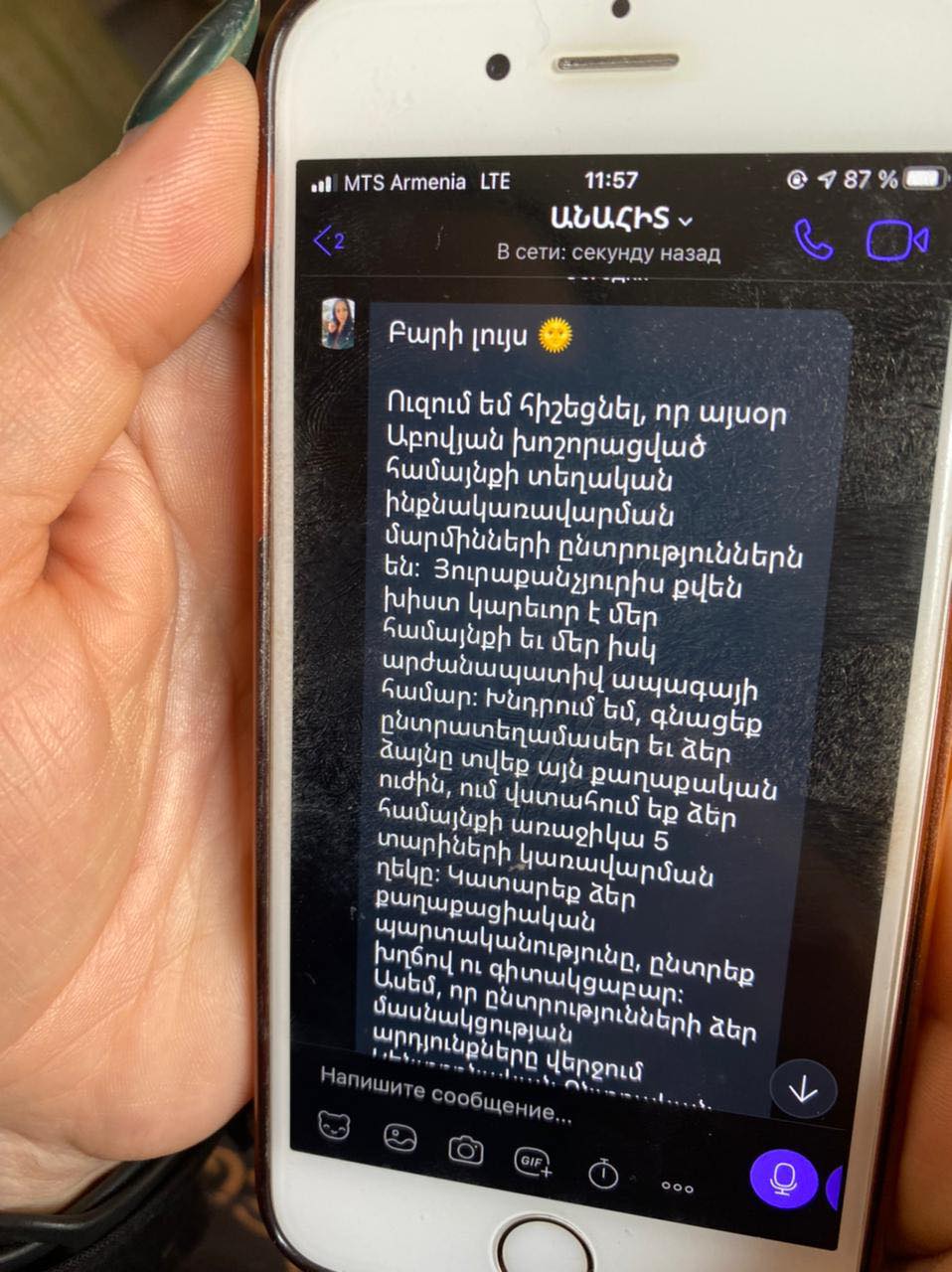 Lraber.online-ը իրազեկվել է այն մասին, որ այսօր՝ վաղ առավոտից, Աբովյան քաղաքի բոլոր բնակիչներին Անահիտ Մկրտչյանը ՝ ՔՊ-ի ավագանու անդամներից մեկը ուղղարկում է ուղղորդող հաղորդագրություններ: