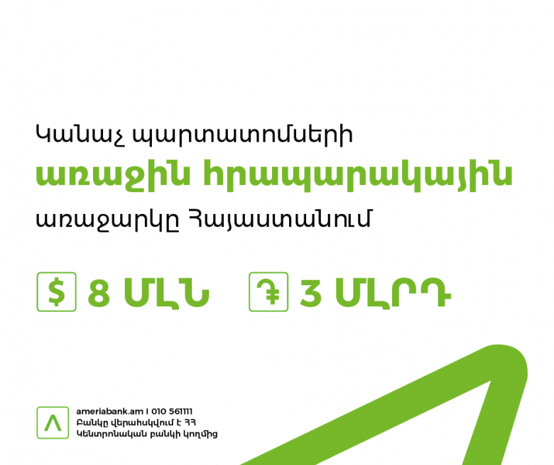 BlogԱմերիաբանկը փետրվարի 14-ից ապրիլի 22-ը ներառյալ իրականացնում է 8 մլն ԱՄՆ դոլար և 3 մլրդ ՀՀ դրամ ծավալով անվանական, արժեկտրոնային, ոչ փաստաթղթային պարտատոմսերի հրապարակային տեղաբաշխում: Սա Հայաստանում կանաչ պարտատոմսերի` հրապարակային առաջարկի միջոցով իրականացվող առաջին տեղաբաշխումն է: Կանաչ պարտատոմսերի տեղաբաշխումից ստացված միջոցներն ուղղվելու են «կանաչ ակտիվների» ֆինանսավորմանը: