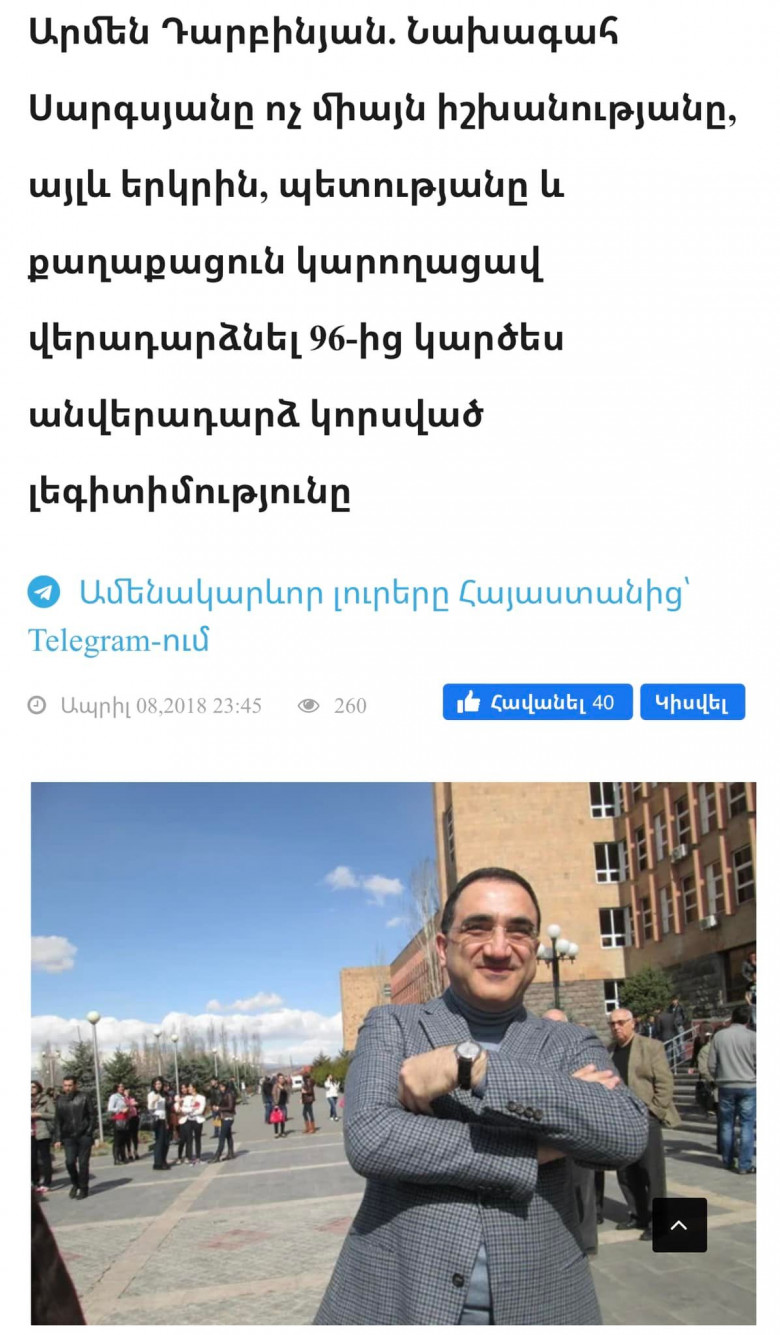 Նկարում առկա տողերը Դարբինյանն ասել է 2018 թվականին, երբ նախագահ Սերժ Սարգսյանն առաջադրվել էր որպես վարչապետի թեկնածու, իսկ դրանից մի քանի օր անց Դարբինյանն այս գրառումը հեռացրեց ֆեյսբուքից և սկսեց «ոռ մտնել» արդեն ազգակործաններին: