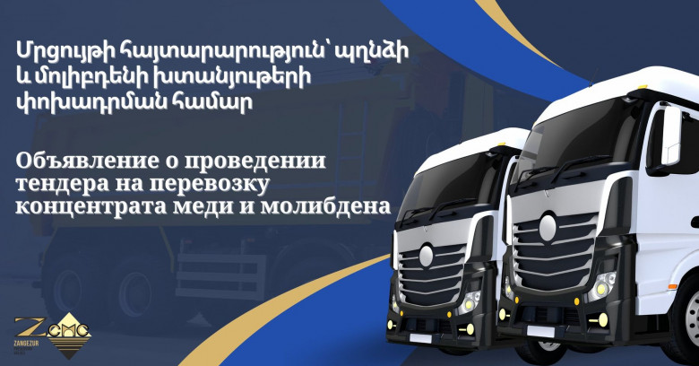 «Զանգեզուրի Պղնձամոլիբդենային Կոմբինատ» ՓԲ Ընկերությունը հայտարարում է մրցույթ 2024 թվականի ընթացքում ներքոնշյալ երթուղիներով տրանսպորտային ծառայությունների մատուցման գծով: