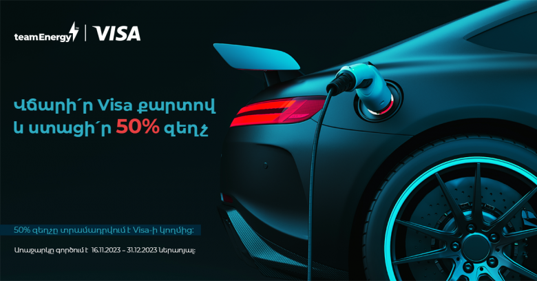 ՀասարակությունTeam Telecom Armenia-ն և Visa-ն գրավիչ առաջարկ են ներկայացնում էլեկտրական մեքենաների վարորդների համար․ Team Energy էլեկտրական մեքենաների լիցքավորման կայաններում վճարումը Visa քարտով կատարելիս հաճախորդից կգանձվի գումարի 50%, իսկ մնացած կեսը կհատուցվի Visa-ի կողմից։