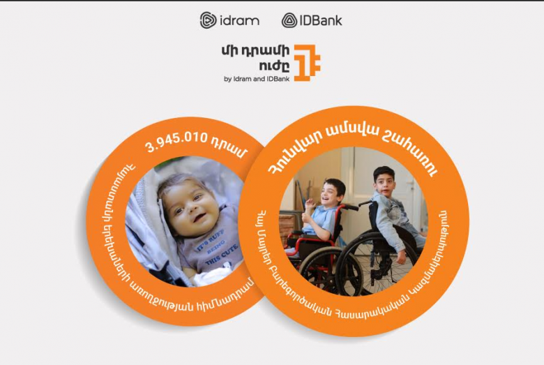 ՀասարակությունԻդրամն ու IDBank-ը ամփոփում են «Մի դրամի ուժը» նախաձեռնության դեկտեմբեր ամսվա ծրագիրը։ Դեկտեմբերին ընկերությունների հաճախորդների կատարած վճարումների դիմաց կուտակված «մի դրամները»՝ 3.945.010 դրամ, այս ամիս ուղղվում են Հայաստանի երեխաների առողջության հիմնադրամին։