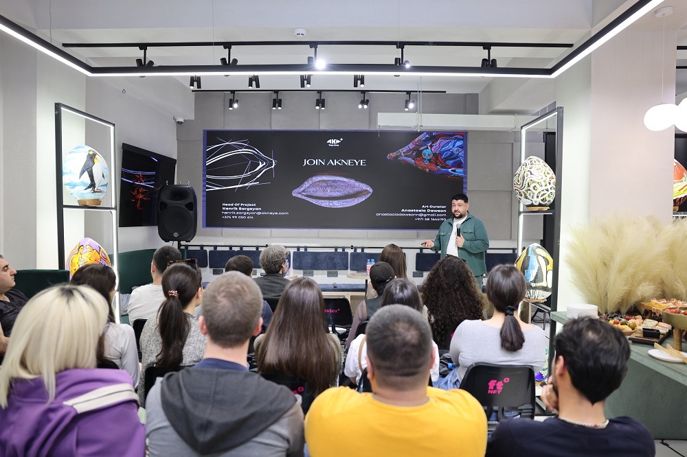 Բլոկչեյն էմբասիի ղեկավար Անդրանիկ Սևոյանը նախ պատմել է AKNEYE-ի մասին, ներկայացրել արվեստի նախագծի հիմնական գաղափարախոսությունը և հայտնել, որ Վենետիկյան Բիենալեի օրերին AKNEYE-ն՝ իր աչքանման քանդակներով և ակնուլունքներով, ցուցադրված կլինի աշխարհում երրորդ ֆիջիթալ սփեյսում: Նա նաև ներկայացրել է՝ ինչպես կարելի է սեփական նախագծերով միանալ AKNEYE համայնքին և ցուցադրության օրերին գործակցել բրենդի հետ: