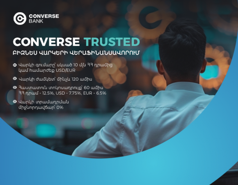 «Փոքր և միջին բիզնեսի ֆինանսավորումը, նրանց համար գործունեության, ընդլայնման ու զարգացման հարմարավետ միջավայրի ստեղծումը, համապարփակ աջակցությունը միշտ եղել է Կոնվերս Բանկի ուշադրության կենտրոնում: Այս արշավի շրջանակում մենք ոչ միայն առաջարկում ենք ֆինանսավորման մրցունակ պայմաններ, այլև հավելյալ բանկային ծառայություններ՝ արտոնյալ պայմաններով: Անվճար կբացվեն և կսպասարկվեն ընթացիկ հաշիվներ, Ինտերնետ բանկ համակարգը, անվճար կտրամադրվի մեկ Visa Business քարտ, հաշվի դրական մնացորդի նկատմամբ եկամուտ կհաշվեգրվի: Շահառուները հասանելիություն կստանան Converse Markets հարթակին, այդ թվում՝ հնարավորություն կունենան արտոնյալ պայմաններով արտարժույթի փոխարկում կատարել, ինչպես նաև կունենան վարկային արձակուրդ ստանալու հնարավորություն»,- ասել են Բանկում: