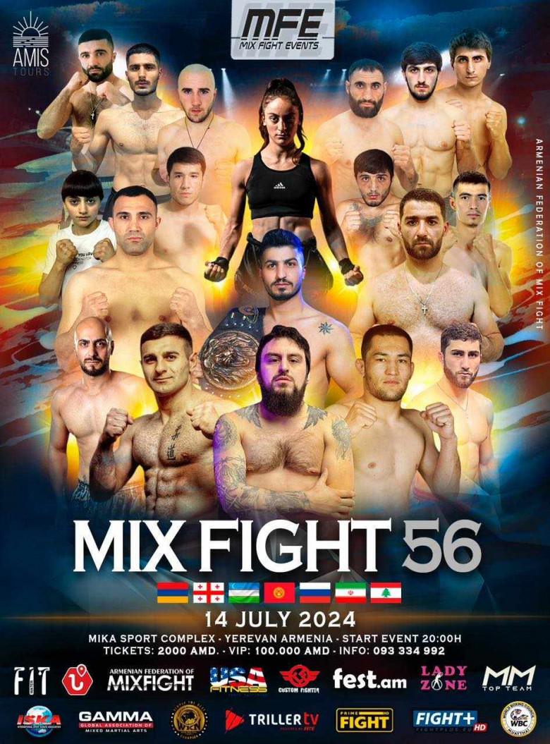 ՍպորտՀուլիսի 12-14-ը իսպանական Mix Fight կազմակերպության 56-րդ մրցաշարը անց է կացվելու Mika մարզական համալիրում: 12-ին և 13-ին լինելու են սիրողական մենամարտերը, իսկ 14-ին պրոֆեսիոնալ 12 մենամարտ: Մրցաշարը միջազգային է, որին մասնակցելու են 7 երկրների ներկայացուցիչներ: Կազմակերպությունը 2019 թվականից մրցաշարեր է անց կացնում Հայաստանում ու յուրաքանչյուր մրցաշարը ավելի բարձր մակարդակով: Մրցաշարը ուղեկցվում է լուսային էֆեկտներով, լեդ էկրաններով, իսկ երաժտությունը ապահովում են հայտնի DJ-ները: Ուղիղ եթերով մրցաշարը հեռարձակվելու է 75 երկրներում: Մրցաշարի նպատակն է մասսայականացնել սպորտը Հայաստանում, թույլ տալ հայ մարզիկներին նախապատրաստվել արտերկրում ելույթների: Mix Fight կազմակերպության շնորհիվ շատ ու շատ մարզիկներ հիմա արդեն մենամարտում են հանրահայտ One, UFC և այլ փրոմոուշեններում: