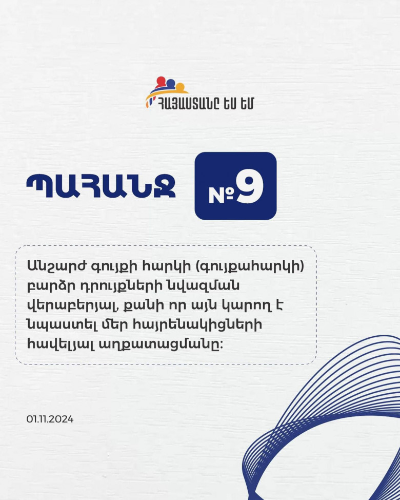 Առաջարկը վերաբերում է անշարժ գույքի հարկի ( գույքահարկի ) բարձր դրույքների նվազմանը, քանի որ այն կարող է նպաստել մեր հայրենակիցների հավելյալ աղքատացմանը։