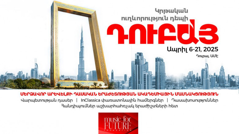 ՀասարակությունՄերձավոր Արևելքի դասական երաժշտության ակադեմիան «Երաժշտություն հանուն ապագայի» հիմնադրամի հետ միասին առաջարկում են ճանապարհորդության բացառիկ հնարավորություն: Հիմնադրամն արդեն երրորդ անգամ նախաձեռնում է «Կրթական ուղևորություն» դեպի Արաբական Միացյալ Էմիրություններ, մասնավորաբար՝ Դուբայ քաղաք՝ Մերձավոր Արևելքի դասական երաժշտության ակադեմիային (Middle East Classical Music Academy-MECMA) մասնակցելու նպատակով: Այն անցկացվելու է 2025 թ․-ի ապրիլի 6-ից 21-ը։ Հիմնադրամն Ակադեմիայի կազմակերպիչներից ստացել է բացառիկ առաջարկ Հայաստանի երաժշտական կրթօջախների սաների և ուսուցիչների համար: