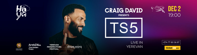 Բաց մի թողեքՄեգա աստղ բրիտանացի արտիստ Քրեյգ Դեյվիդը կներկայացնի իր հանրահայտ, ցնցող TS5 շոուն, որով նա հանդես է եկել աշխարհի խոշոր դահլիճներում՝ Լոնդոնից մինչև Լոս Անջելես, «Գլաստոնբերի»-ից մինչև O2 Academy Brixton։ Համերգի ընթացքում Քրեյգ Դեյվիդը կկատարի "7 Days", "Fill Me In", "Walking Away" հիթերը՝ զուգակցված բացառիկ DJ ռեմիքսներով։