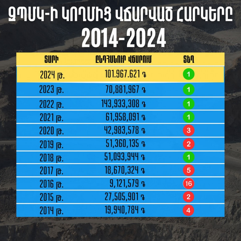 2024թ․-ի ընթացքում կոմբինատը վճարել է շուրջ 102 միլիարդ դրամ հարկ։ 2023թ.-ի համեմատ ԶՊՄԿ-ն ավելի քան 31 միլիարդ դրամով ավելի հարկ է վճարել: