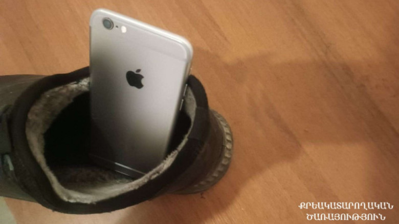 Խուզարկությամբ ծառայողները վերջինիս կոշիկի միջից հայտնաբերել են բջջային հեռախոս` բաժանորդային քարտով։