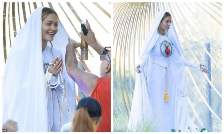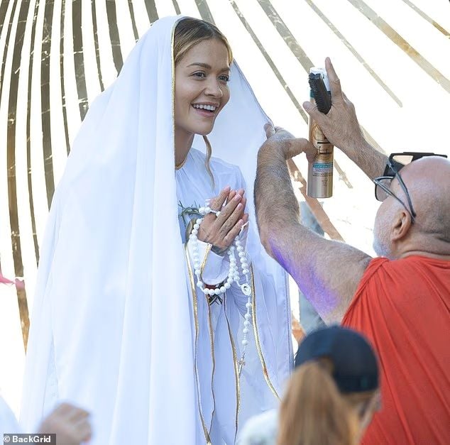 Самое популяроне34-летняя певица Рита Ора предстала в неожиданном и дерзком образе во время съёмки в Лос-Анджелесе. Артистка облачилась в белоснежные свободные одежды и длинную фату до пола, держа в руках чётки и позируя с молитвенно сложенными руками, пишет Daily Mail.