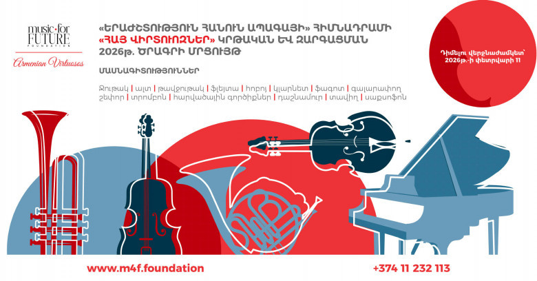 Фонд реализует образовательную программу «Армянские виртуозы», которая объявляет о своем очередном конкурсе. У юных армянских музыкантов в возрасте от 10 до 16 лет есть уникальная возможность стать членом большой музыкальной семьи. Таким образом, дан старт конкурсу образовательной и развивающей программы 2026 года «Армянские виртуозы» фонда «Музыка во имя будущего».