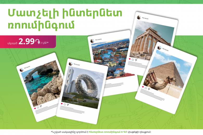 Кстати, в случае если абонент не активирует какой-либо пакет до 31 августа, то он(-а) в любом случае воспользуется более доступным тарифом интернета в роуминге в 9 драмов/МБ вместо прежних 15 драмов/МБ, в частности при поездках в Болгарию, Грецию, на Кипр, в Италию, Испанию и Черногорию, подключившись при этом к сети соответствующих операторов. Также следует отметить, что тариф в 9 драмов/МБ действует бессрочно при подключении к операторам Orange в Египте, Geocell/Magticom в Грузии, du в ОАЭ и T-Mobile в США.